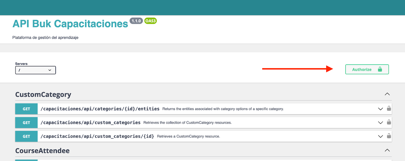 Agora que você já tem suakeyde acesso, você deve acessar a documentação da API. A documentação é pública e você pode acessá-la através da URL da empresa seguida por/capacitaciones/docs. Por exemplo, se sua empresa se chama superdemo e você usa o domínio “boostworld.com”, a URL seria https://superdemo.boostworld.com/capacitaciones/docs. Por outro lado, se sua empresa for Buk e você usar o domínio “buk.cl”, a URL seriahttps://buk.buk.cl/capacitaciones/docs.