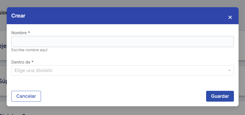 - Ação a partir de cada divisão, área ou departamento: Será exibida uma janela pop-up onde o campo "Dentro de" já vem preenchido com a divisão à qual está sendo adicionado um novo elemento.