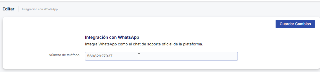 Ao editar a integração, você deverá inserir o número de telefone que responderá o chat no campo "Número de telefone".