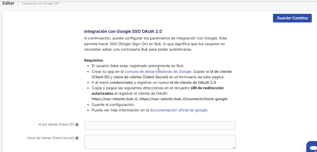 Ao editar a integração, você deverá completar a informação do ID e a chave do cliente.