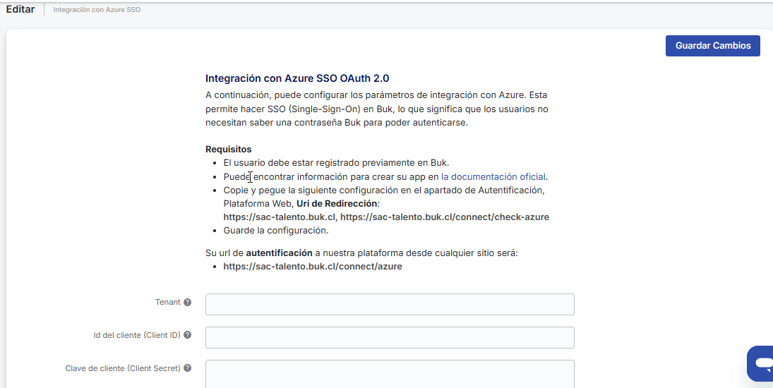 Essa ação é executada automaticamente todos os dias às 9:00 am; no entanto, pode ser sincronizada manualmente a partir do “Centro de Dados” pressionando o ícone de sincronização com Buk. Esta integração contém os seguintes campos: Rut, Nome, Apellido, mail, jefatura, tramo Sence, estado (activo o inactivo), imagen de perfil, departamento, cargo y división.