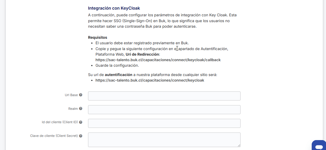 O objetivo deste artigo é fornecer um guia detalhado sobre como acessar e gerenciar as diferentes integrações disponíveis no LMS. O alcance inclui instruções para ativar e configurar integrações como SSO (Auth0, Google, Azure Active Directory, Facebook, Key Cloak), sincronização de usuários (Buk), suporte (Intercom, WhatsApp) e acesso a catálogos de cursos externos (Udemy, Coursera). Também aborda funcionalidades específicas como instâncias públicas para cursos Bukplay, conformidade normativa (Constancias SIRCE) e ferramentas avançadas como Buk Copilot. Apenas os usuários com o papel de Superadministrador podem acessar a configuração de integrações do LMS.