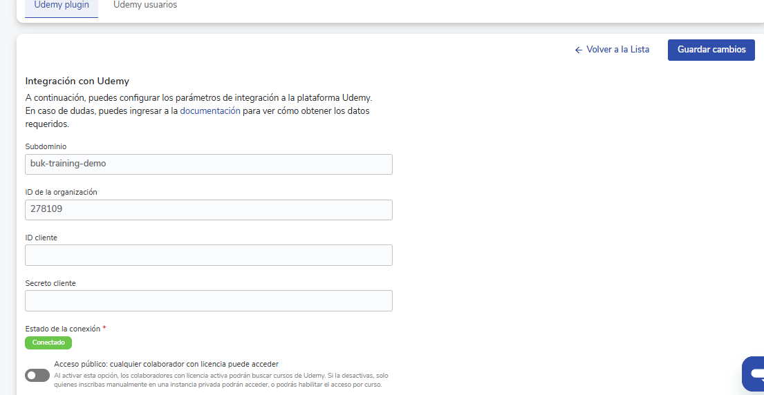 Com a integração ativa, a partir desta seção você pode configurar para que todos os cursos desse fornecedor tenham acesso público, revisar os usuários vinculados ao Udemy e sincronizar as informações dos colaboradores e seus avanços.