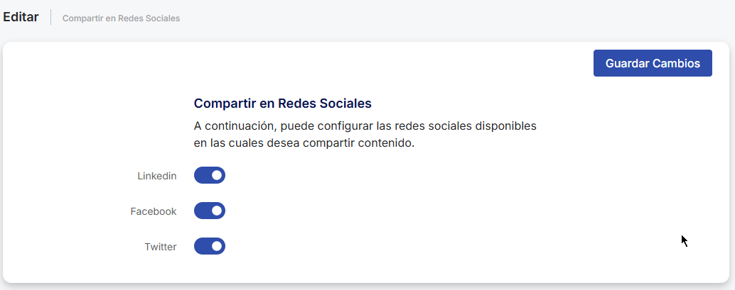 Compartilhar en RRSS:Integração que permite ativar ou desativar as diferentes RRSS para poder compartilhar as conquistas dos usuários colaboradores ao finalizar os cursos aprovados.