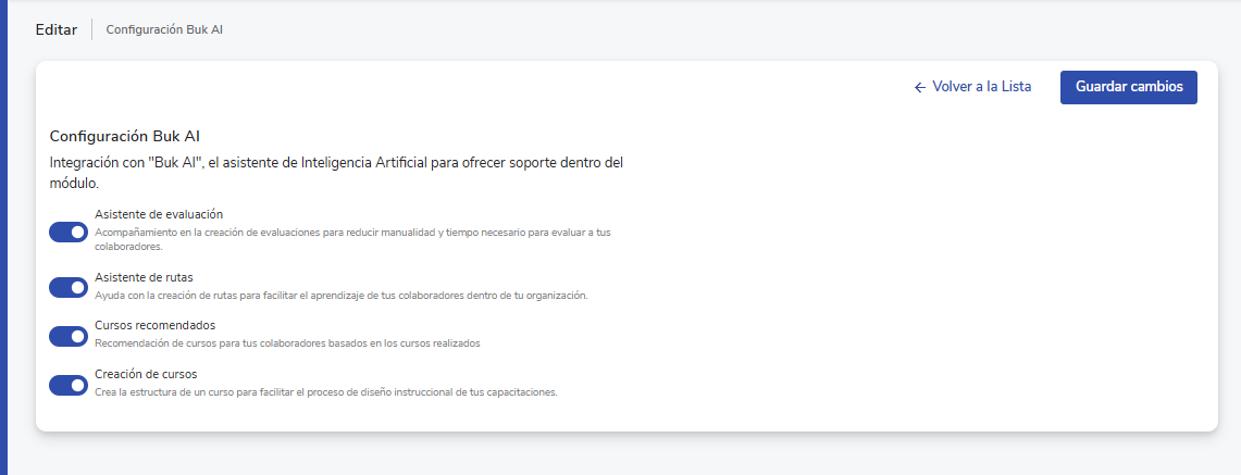 Buk AI:Essa integração permite ativar um assistente virtual que utiliza Inteligência Artificial dentro do LMS. Uma vez habilitado, você deverá clicar em "Editar" para ativar especificamente a seção do LMS na qual requer a assistência do Buk AI.