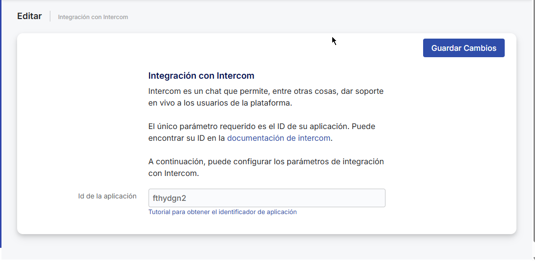Intercom:É o chat que permite fornecer suporte ao vivo aos usuários da plataforma. Ao editar a integração, você deverá completar o ID da sua aplicação.
