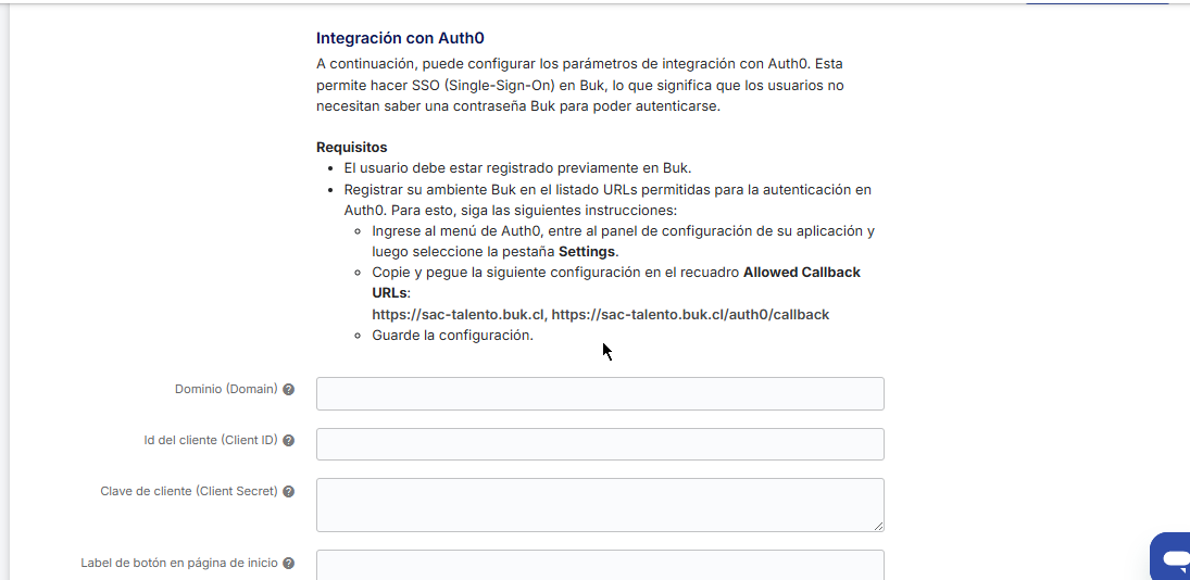 Ao editar a integração, você deverá preencher os seguintes dados: Dominio (referente ao domínio de autenticação, por exemplo:boost.autho.com), ID do cliente (cliente Auth0), chave do cliente e label do botão na página inicial (referente ao texto do botão exibido na página inicial).
