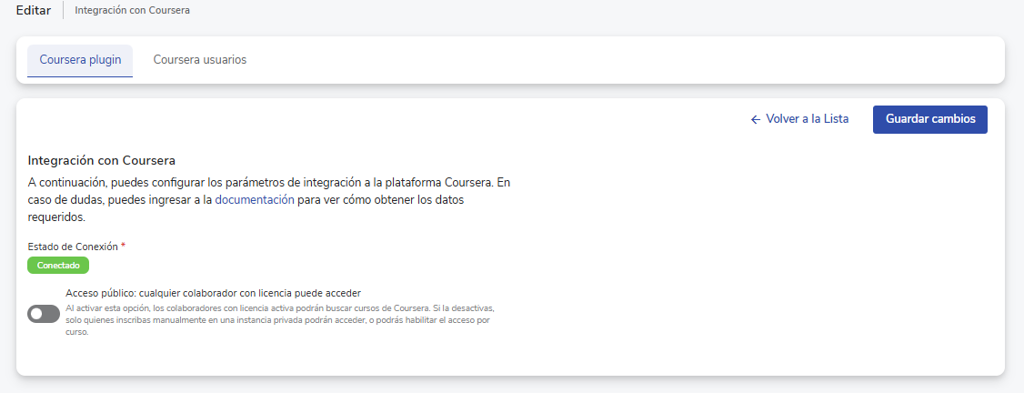 Com a integração ativa, a partir desta seção você pode configurar para que todos os cursos desse fornecedor tenham instâncias públicas, revisar os usuários vinculados ao Coursera e sincronizar as informações dos colaboradores e seus avanços.