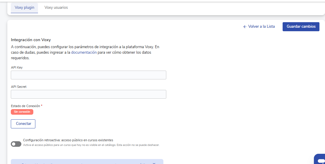 Com a integração ativa, a partir desta seção você pode configurar para que todos os cursos desse fornecedor tenham acesso público, revisar os usuários vinculados à Voxy e sincronizar as informações dos colaboradores e seus avanços.