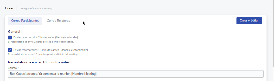 Formato de e-mails:Você poderá configurar o envio automático de e-mails e lembretes para participantes e relatores: