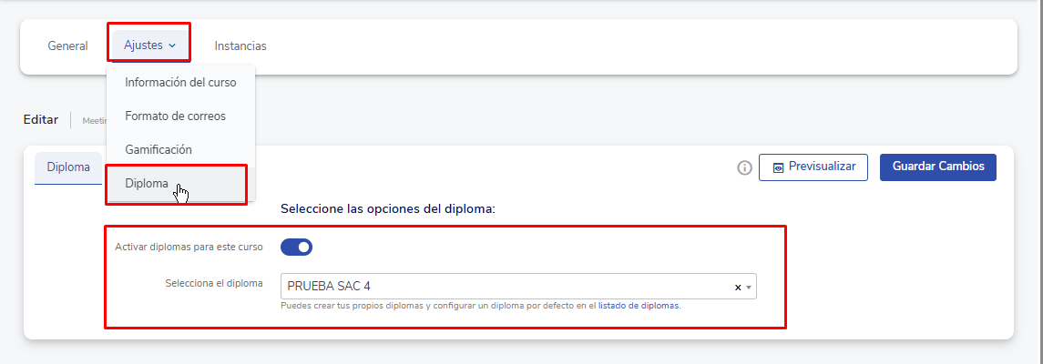 Diplomas:Você pode ativar os diplomas para este curso e escolher um previamente carregado na seção de diplomas.