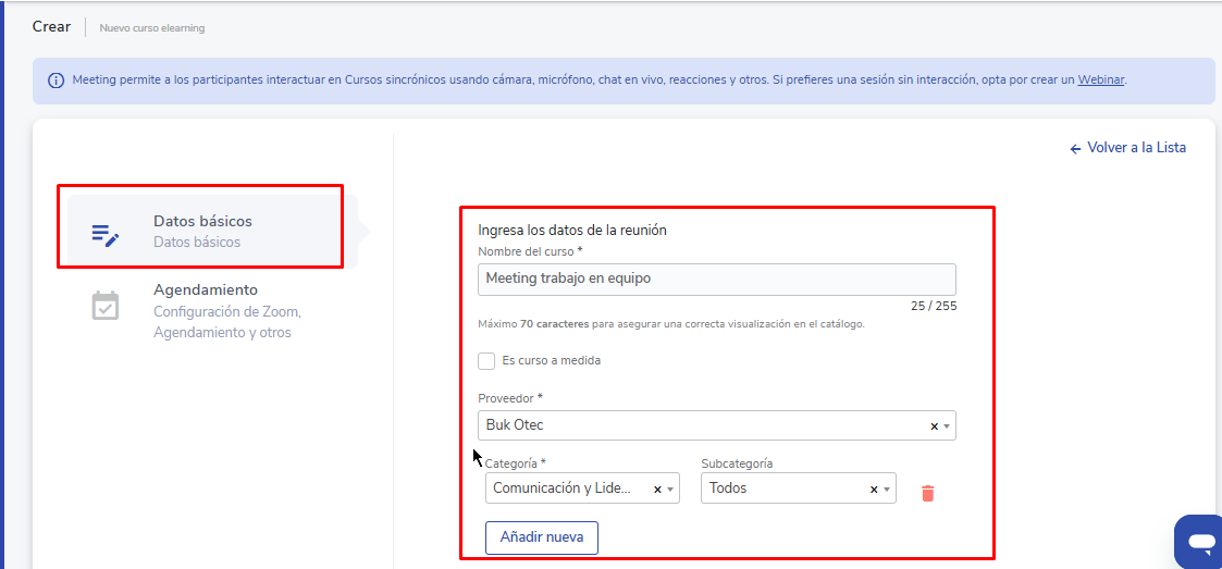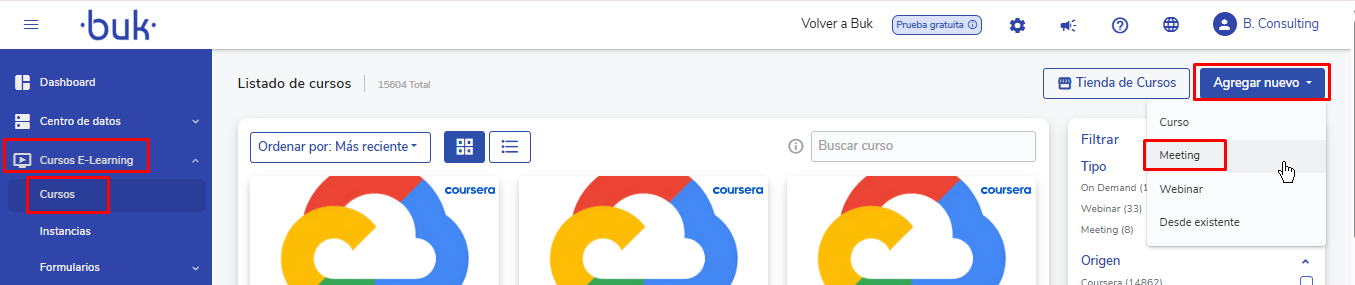 Para começar, acesse a seção "Cursos E-learning" no menu lateral e clique em "Cursos". Em seguida selecione "Agregar nuevo" e escolha a opção "Meeting".