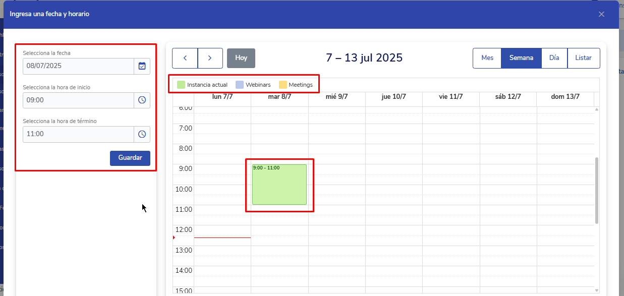 - Agendamiento: Clique no modal de "Agendamiento" e preencha a data, hora de início e término. Depois verifique a disponibilidade com respeito a outros cursos síncronos agendados, selecione e salve.