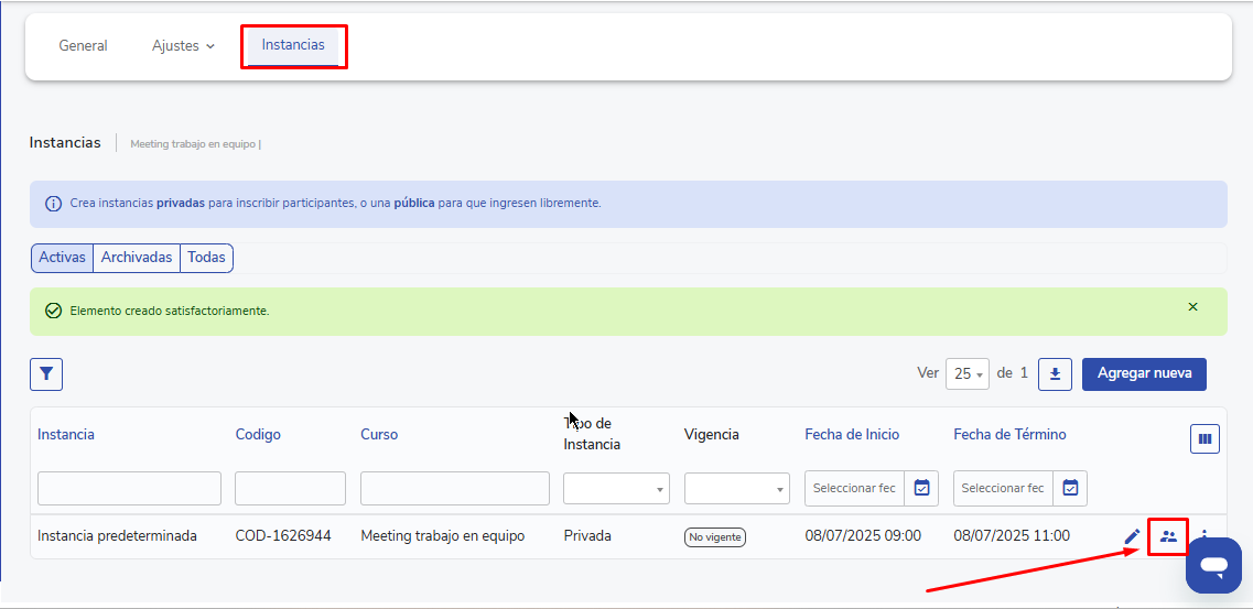 Este artigo foi projetado para orientar os usuarios com rol de súper administrador e administrador na criação de um curso tipoMeetingdentro do LMS. O objetivo é instruir sobre o passo a passo requerido para configurar corretamente um curso síncrono com todas as suas informações, agendamento e instâncias, incluindo a asignación de un relator y participantes.