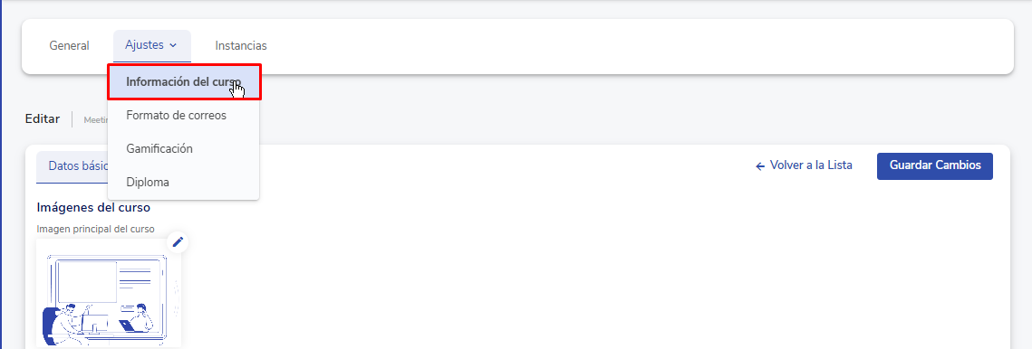 Vá para "Ajustes" e selecione "Información del curso" para completar ou editar os campos opcionais.