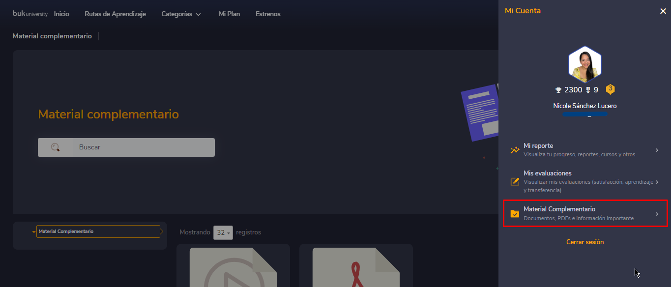 A seçãoMaterial Complementarpermite carregar e administrar arquivos que serão visíveis individualmente para os usuários em seu perfil, em uma pasta específica com o mesmo nome. Esses documentos não são utilizados como conteúdo para cursos e-learning, mas sim como recursos complementares de consulta.