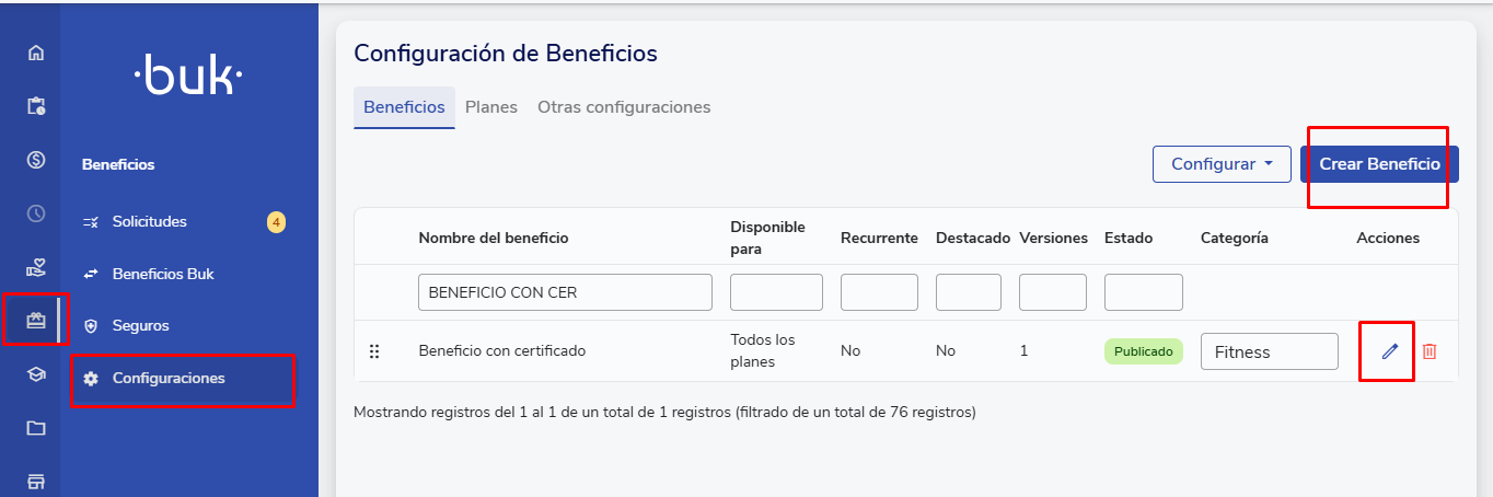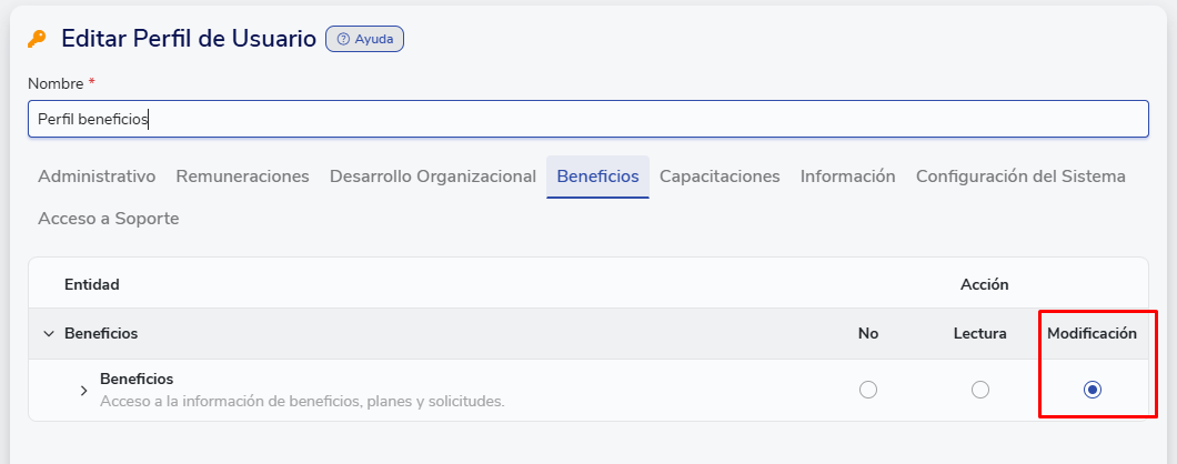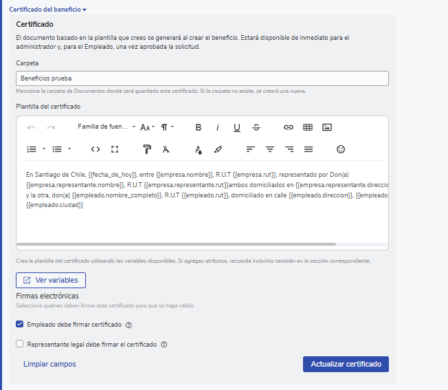 Para configurar um certificado de beneficios, certifique-se de ter a permissão de creación/modificación de beneficios, a qual deve ser concedida pelo Administrador da sua plataforma.