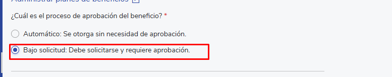 Para que a opção“Certificado de benefícios”, no campoQual é o processo de aprovação de benefícios?debe selecionar la opción“Sob solicitação”.