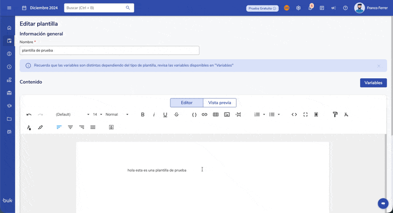 Agora você pode adicionar variáveis (como{{nombre_candidato}}ou{{cargo}}) diretamente da barra de ferramentas do editor de texto, permitindo encontrá-las e inseri-las muito mais rápido.