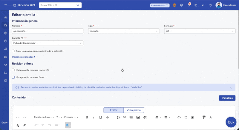 - Visualização Prévia:Ao visualizar um template (sem dados reais), será exibido um QR "flaky" ou padrão (que direciona para o link da Buk) para simular como ficará o documento final.