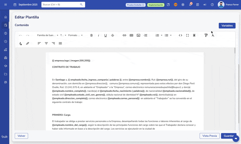 A partir da tela inicial da sua plataforma Buk, vá até o menu principal localizado no lado esquerdo da tela. Dentro do menu"Administrativo"e no módulo"Documentos e Assinatura", aba"Modelos", selecione o modelo que deseja editar ou crie um novo para acessar o editor.