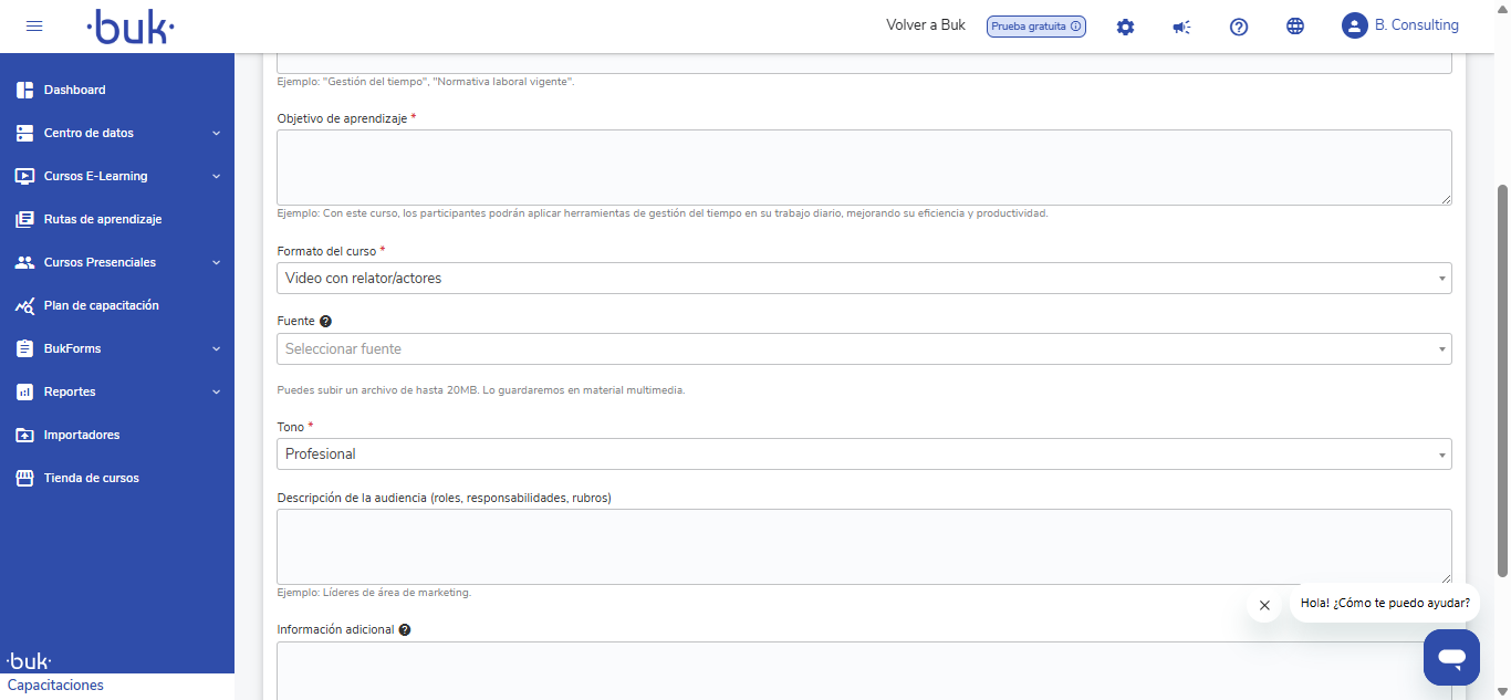 Formato del curso:(video con relator/actores o video animado): Define el medio visual y narrativo de entrega. Buk AI adapta la estructura del guion (separando diálogos, escenas o instrucciones visuales) según si el contenido será presentado por personas reales o mediante recursos gráficos animados.