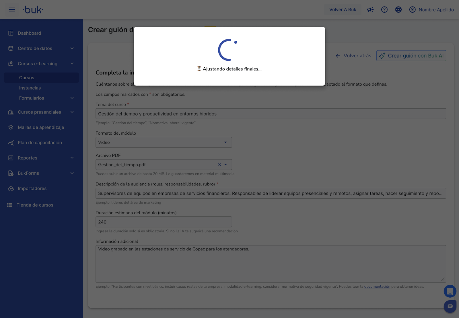 Buk AI te ayuda a convertir tus ideas y materiales en un guión instruccional completo, claro y listo para avanzar a producción.