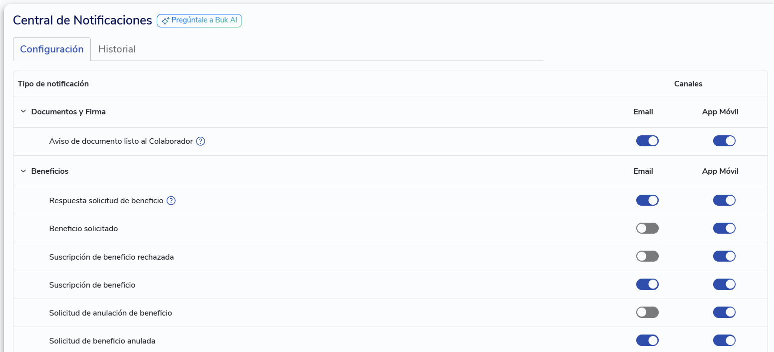 No Buk você pode personalizar como recebe as notificações, escolhendo os canais que preferir para cada tipo de aviso. Atualmente, os canais disponíveis sãoe-mail,App MóveleSMS. Em breve, serão adicionadas novas opções como Google Chat, Slack e Teams.