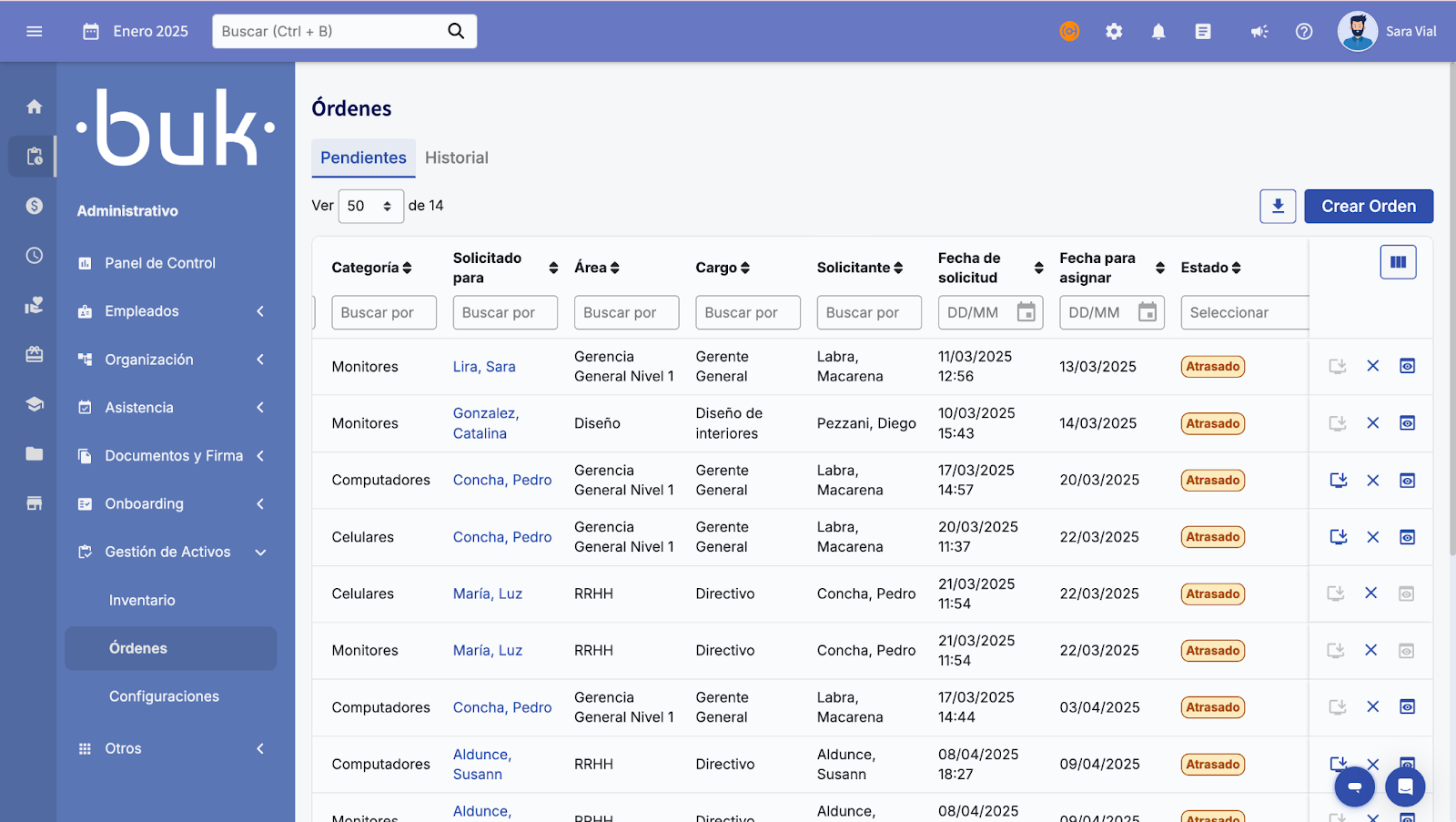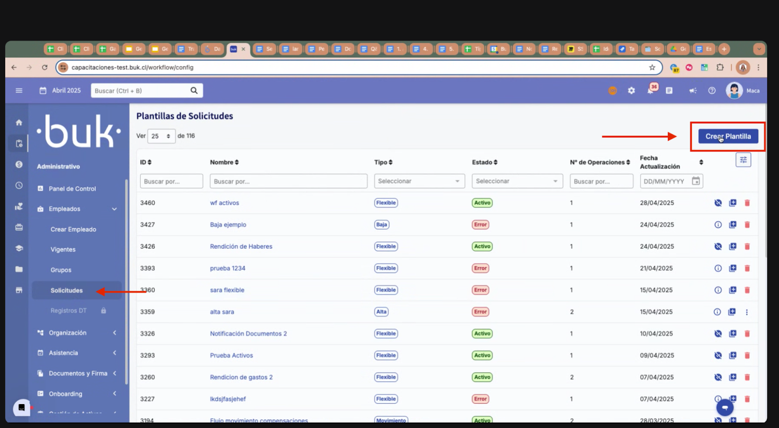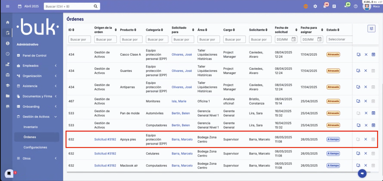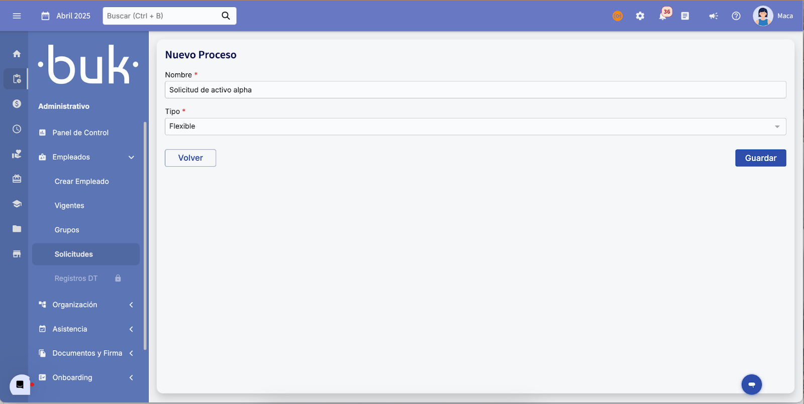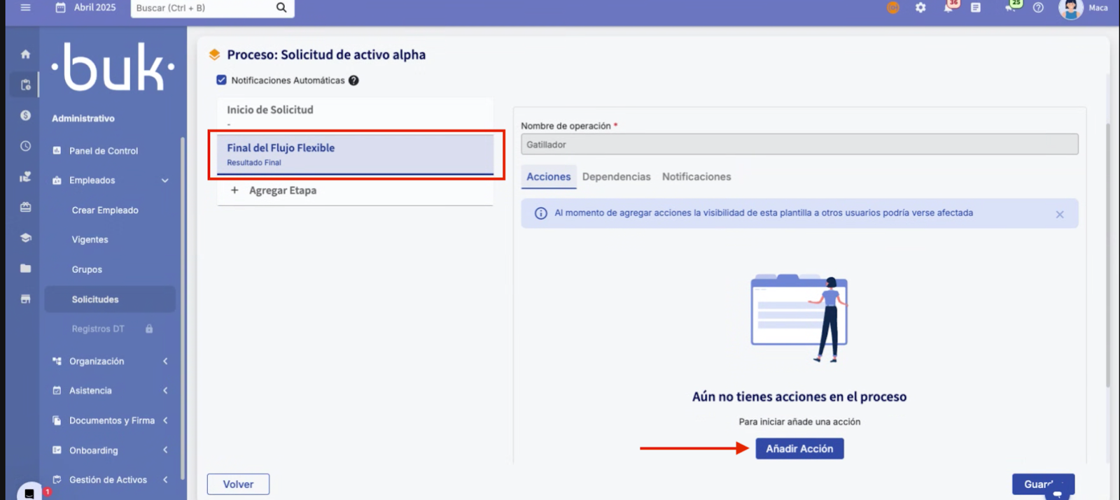 Se a sua empresa não tem Workflow, o Buk inclui um modelo pré-configurado chamado "Solicitud de Activo", que automatiza o processo desde a solicitação até a atribuição. Para começar, vá para: