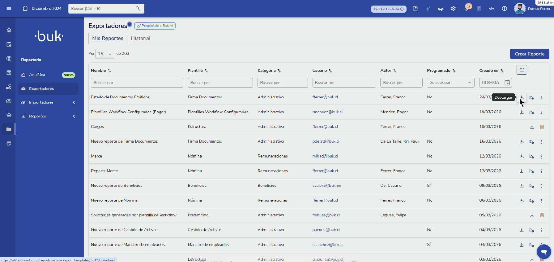 - Clique no ícone deBaixar(seta para baixo) localizado ao final da linha do relatório.