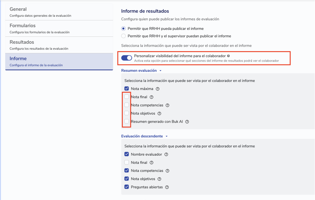 Ao configurar uma avaliação, você tem a flexibilidade depersonalizar o formato dos relatórios, ocultando ou exibindo as seções que considerar necessárias. No entanto,como administrador ou líder, você sempre manterá o acesso à versión completapara assegurar um acompanhamento integral do processo.